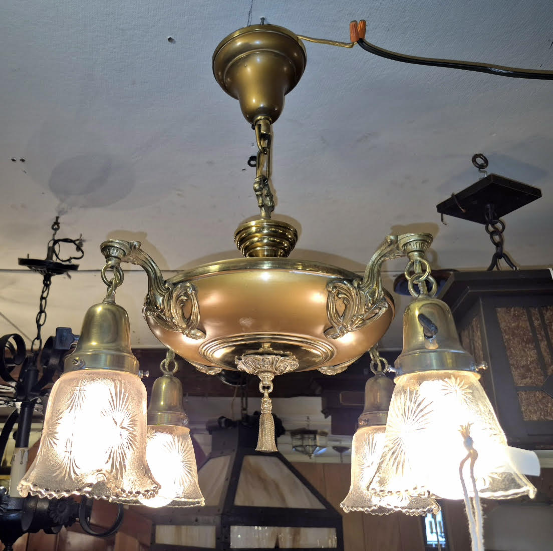 1930s Brass polychrome pan ceiling light with and original pressed glass shades. Hangs 22″ and is 19″ wide.