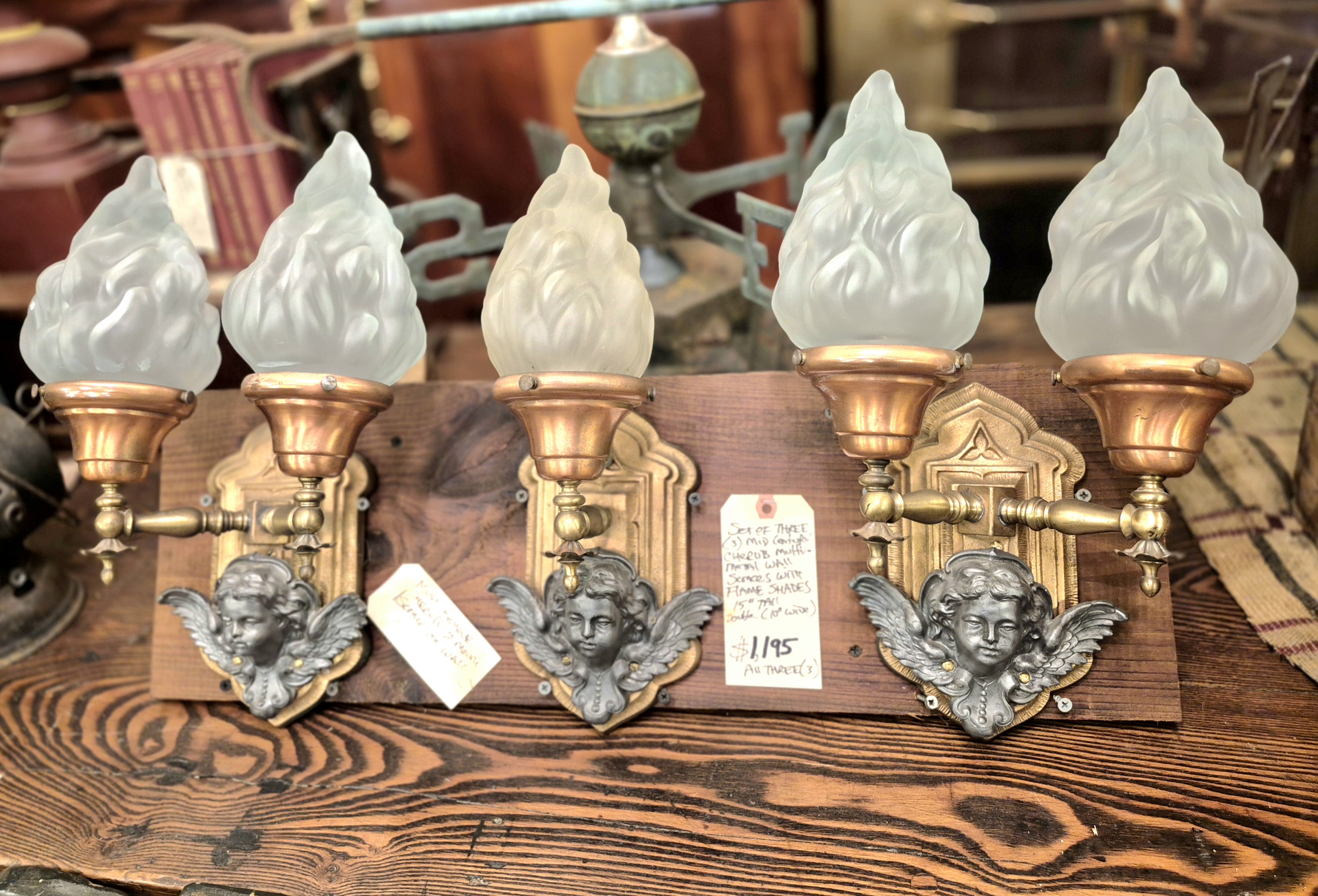 Set of three multi metal cherub wall sconces with flame shades. Each is 15″ tall with double sconces 10″ wide.