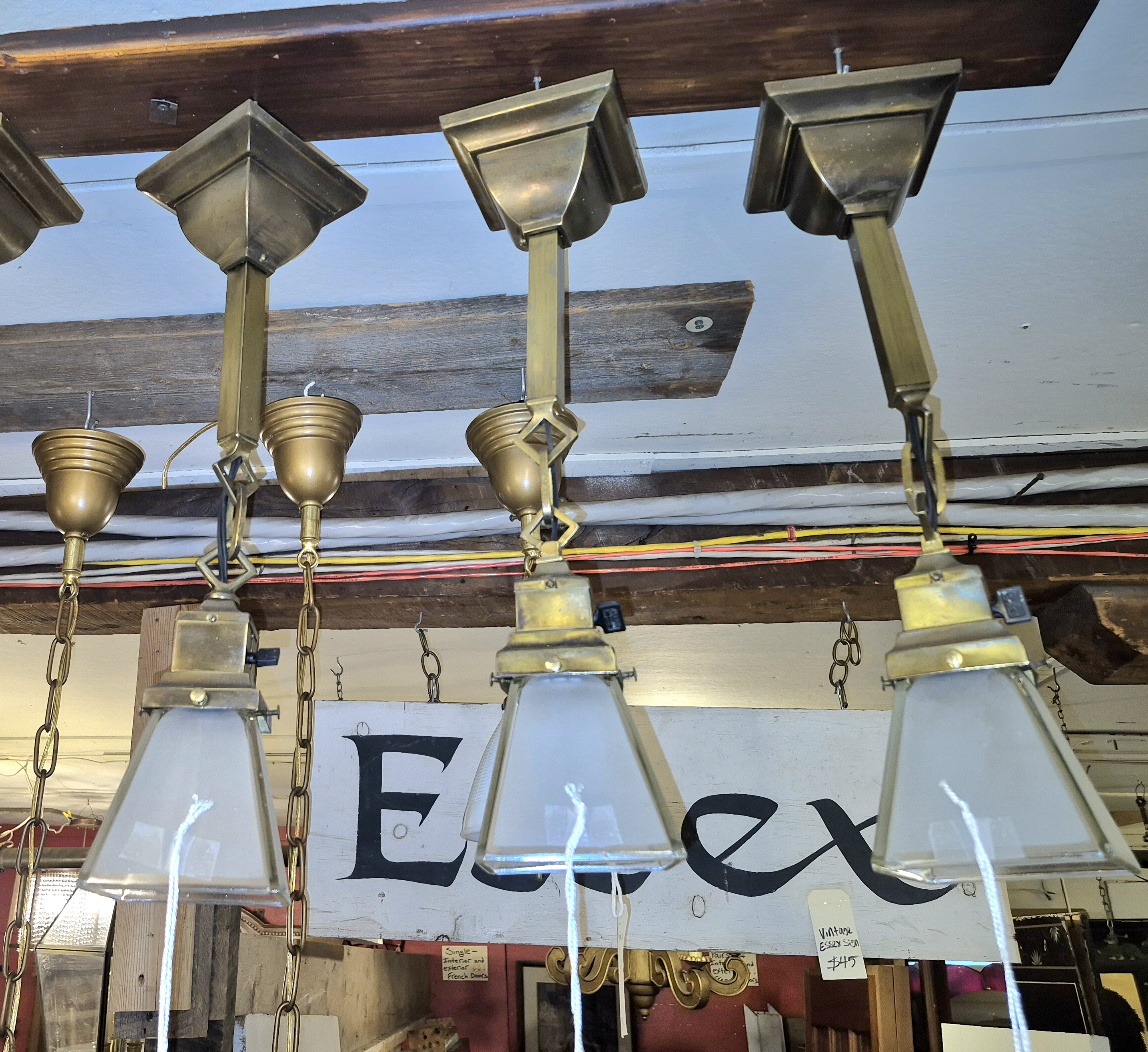 We have a number of these 1910 brass craftsman pendant lights. Each hangs 18″. Please call or email for quantity, Available with rounded Greek key shades also,