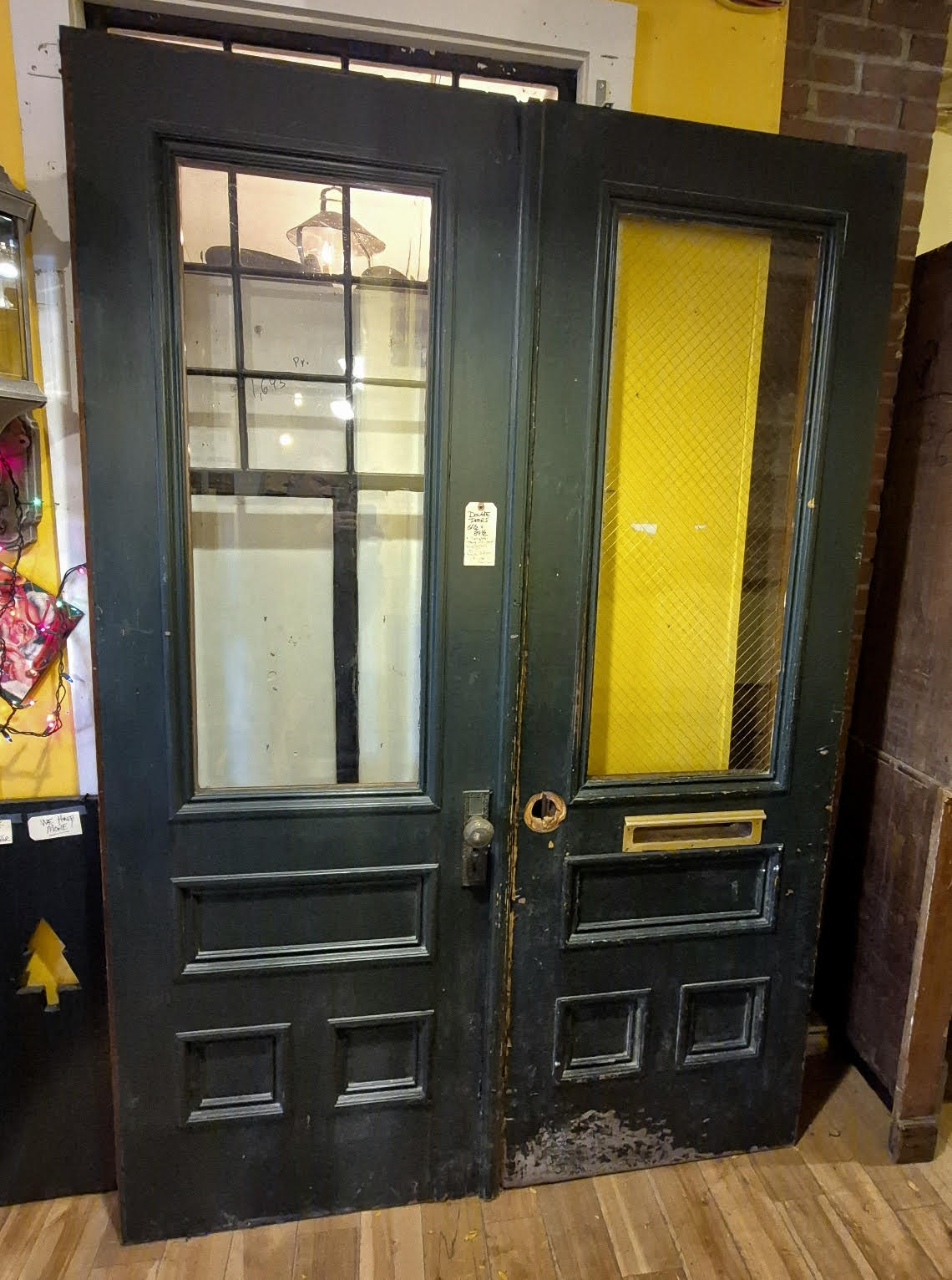 Set of double entry doors from Champlain College in Burlington Vermont. Measures 61 1/2″ wide by 89 1/2″ tall. Green painted outside surface cherry inside. One side has chicken wire glass other is clear.