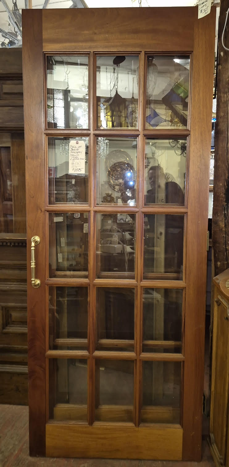 Set of solid mahogany french doors measuring 72″ wide by 88 1/2″ tall. C 1990 with hardware. From a mansion in Stowe Vermont.